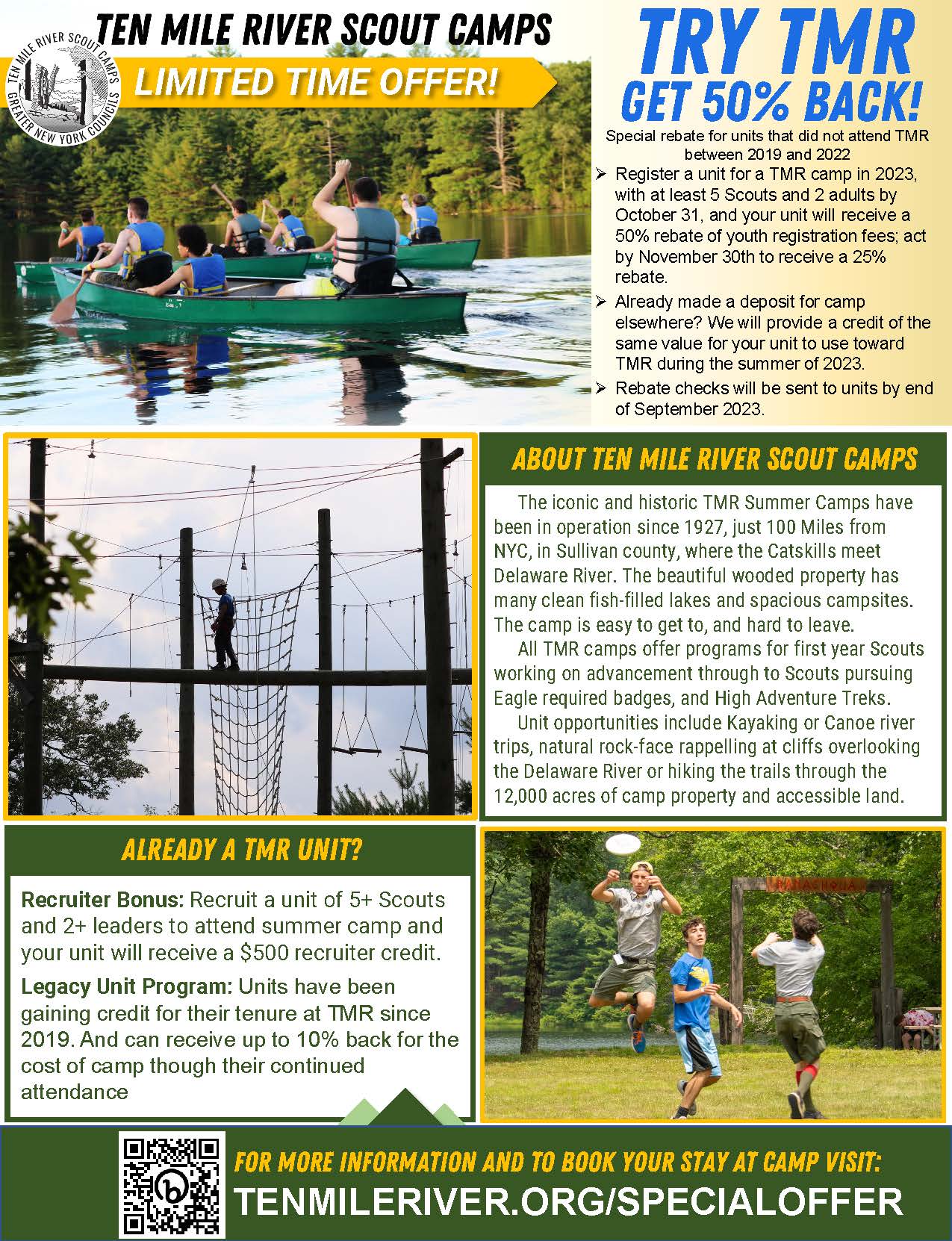 *Register a unit, of at least 5 Scouts and 2 adults, for a TMR Camp in 2023, by October 31, and your unit will receive a 50%, act by November 30th to still receive a 25% rebate